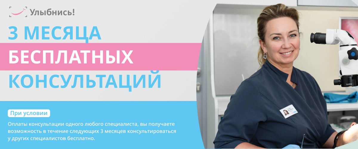После первого оплаченного визита вы получаете возможность в течение следующих 3 месяцев посещать любых других специалистов клиники абсолютно бесплатно.