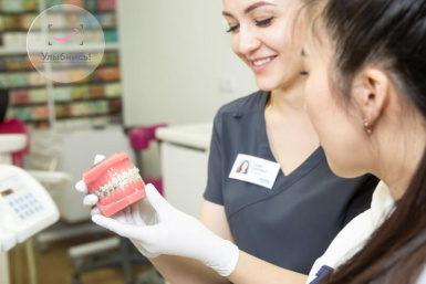 Процедура установки брекетов с лигатурами на зубы пациента