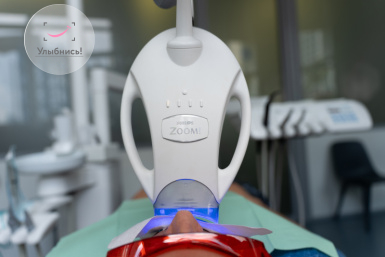 - ZOOM-4 – химический вариант обработки эмали перекисью водорода под воздействием специальной лампы. Излучение является катализатором хим. процесса, при котором из молекул водорода высвобождается атомарный кислород и уничтожает пигмент. Такую процедуру еще называют фотоотбеливанием, потому что активизатором процесса становится световое излучение. Предварительно необходимо тщательное очищение обрабатываемой поверхности. Его выполняют ультразвуком и аппаратной чисткой Аир Флоу.