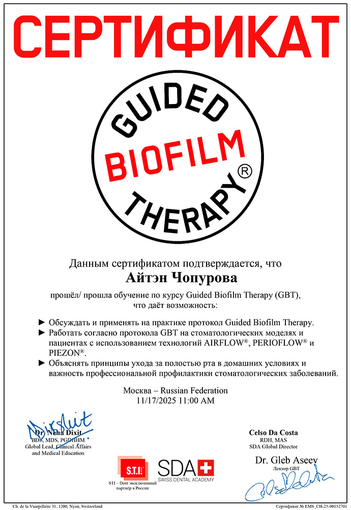 Прошла обучение по курсу Guided Biofilm Therapy (GBT)