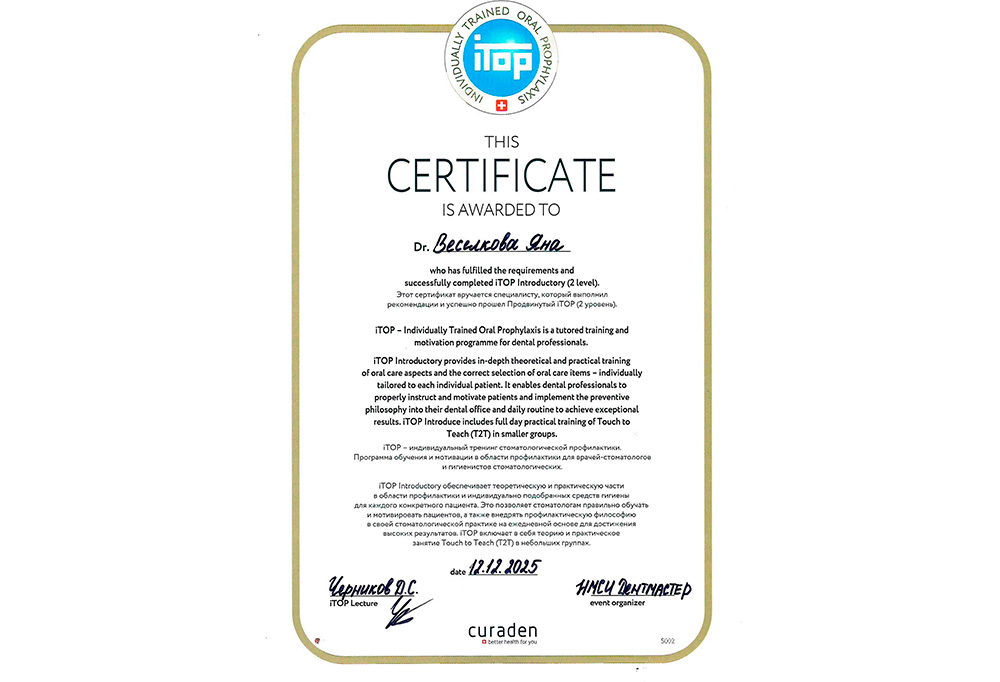 «В сфере стоматологии я работаю уже более семи лет. Начинала свою карьеру как ассистент стоматолога. Затем решила продолжить образование и окончила Московский стоматологический колледж № 1 по специальности "гигиенист стоматологический".